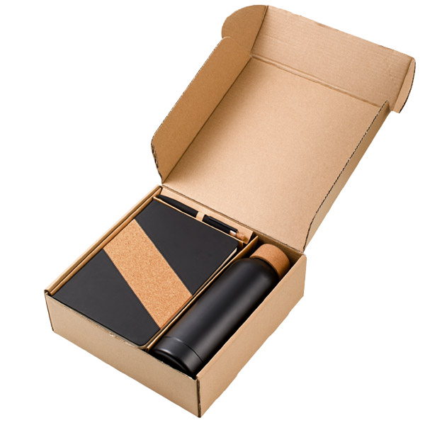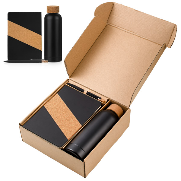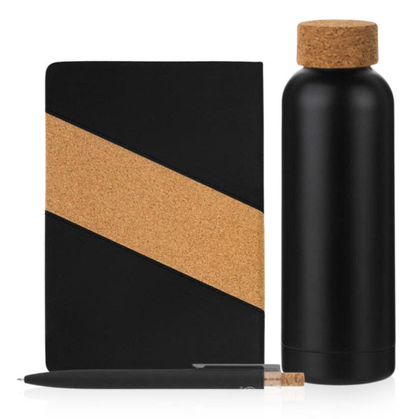 בקבוק תרמי מחברת דמוי עור ועט מתכת משולבים עם שעם
